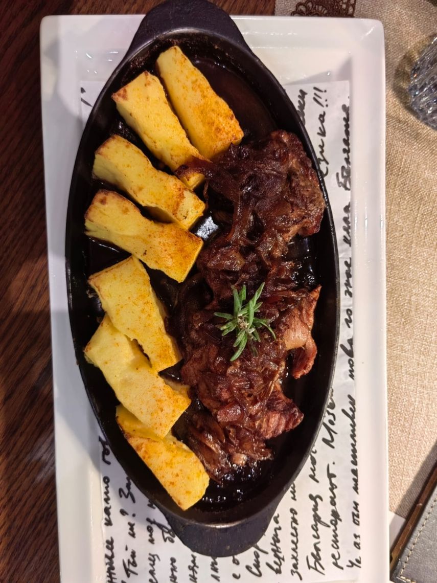 Vită, cu ceapă caramelizată și mămăligă. Lasă vita, lasă ceapa, nu vrei să știi cât era de bună mămăliga aia.