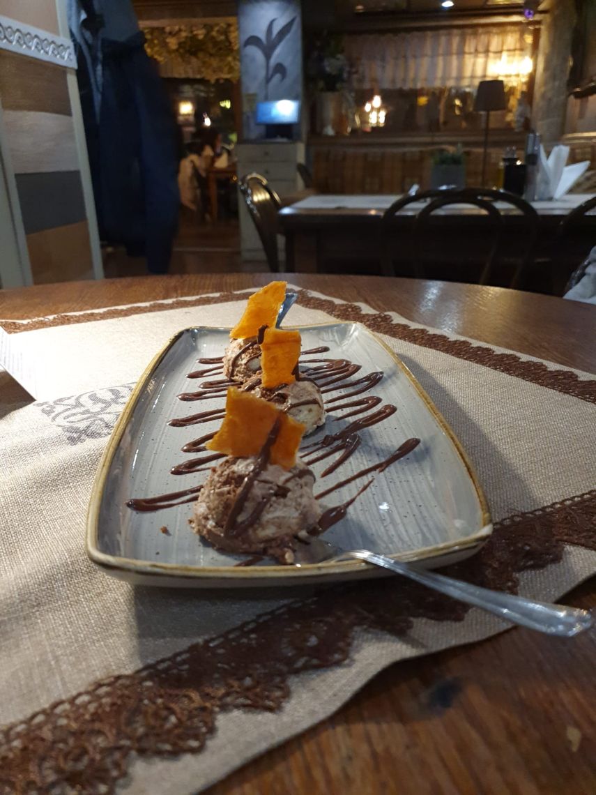 Cum să vă explic ca să înțelegeți? Când ajung într-un oraș pe care nu l-am mai vizitat, nu mănânc de două ori în același loc decât dacă în locul ăla gătește Marele Manitou cu mânuțele lui. Well, fraților, la Щастливеца (Shtastliveca) sunt convins că era Bărbosul în bucătărie și prepara chestii. Poate nu pe toate, că, na, mai avea și alte treburi, dar desertul ăsta, pre numele lui mirean „biscuit cake” era făcut de el personal, n-avea încredere să lase pe altcineva să se bage la minunăția asta.