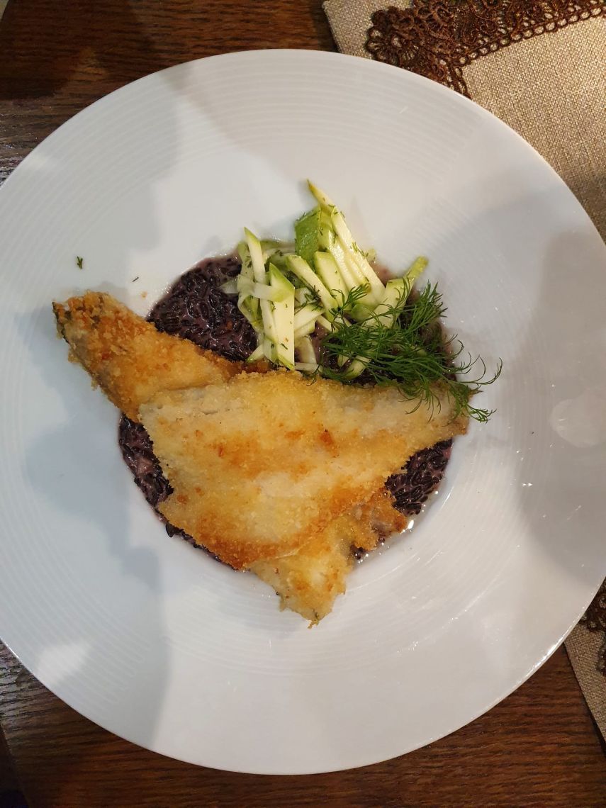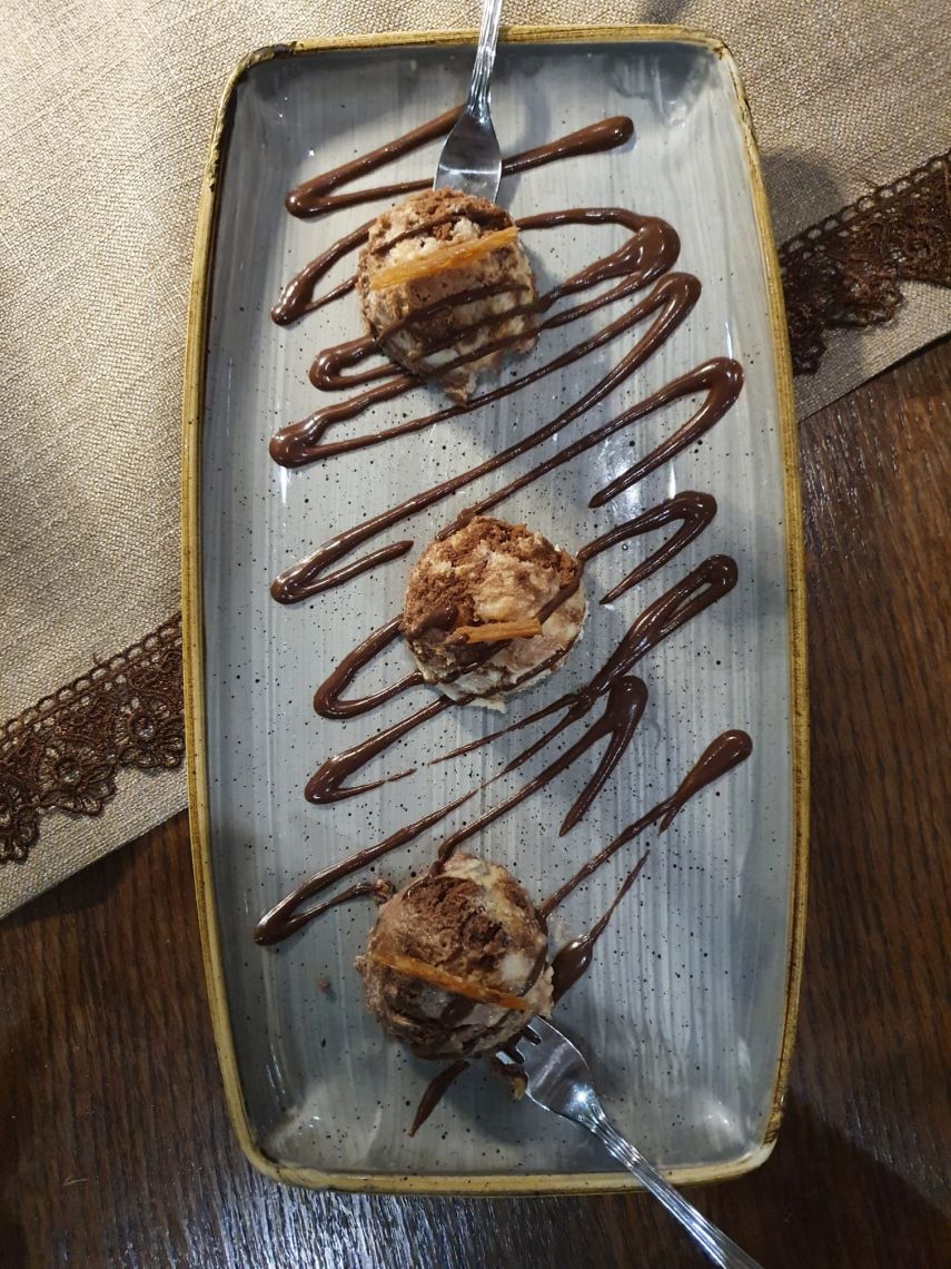 Râdem-glumim, dar dacă ajungeți la Veliko, mergeți la Shtastliveca. Nu mă interesează ce comandați de mâncare (deși eu v-aș sfătui dezinteresat pentru un lup de mare în parmezan, pe pat de orez negru), dar luați-vă desertul ăsta: biscuit cake. O să mă pomeniți multă vreme, cu lacrimi de recunoștință în ochi. Aveți ambele preparate printre poze, să nu vă dezorienteze mărimea farfuriilor, sunt supra-dimensionate și pare că în ele e mâncare cât pentru un șoricel. Mda, doar dacă șoricelul are peste suta de kile. Pentru comparație, aveți și-o farfurie, de dimensiuni normale, cu ce și-a comandat seara fashionista.