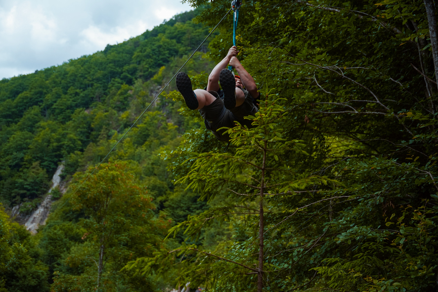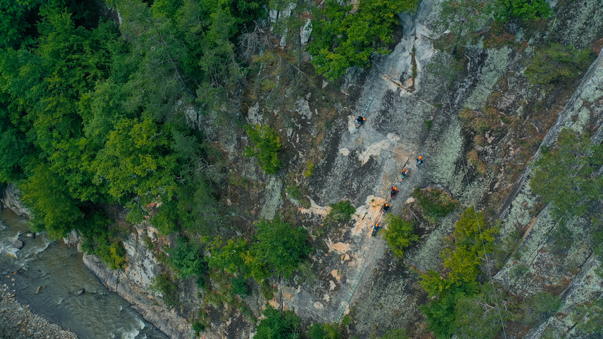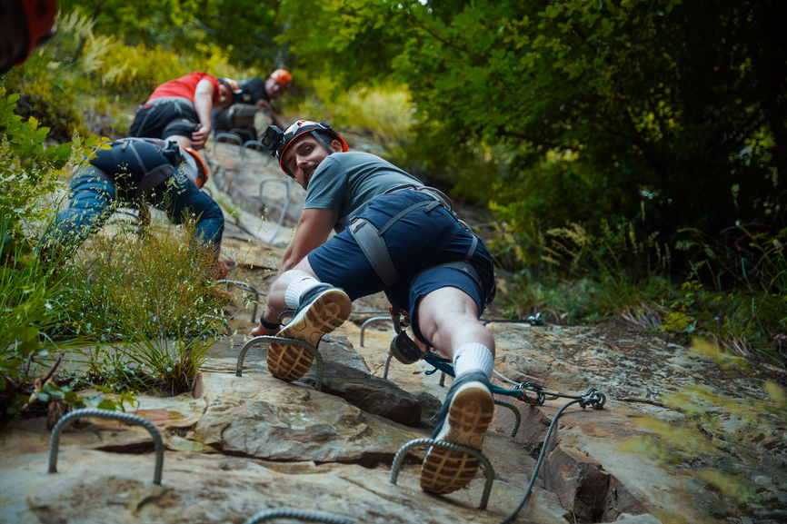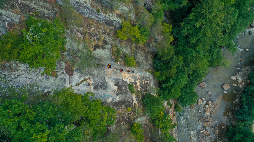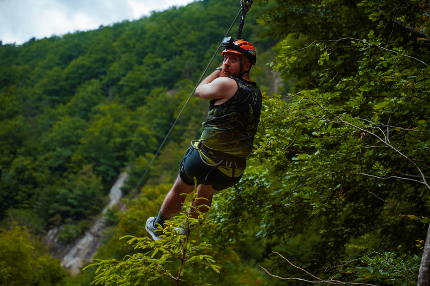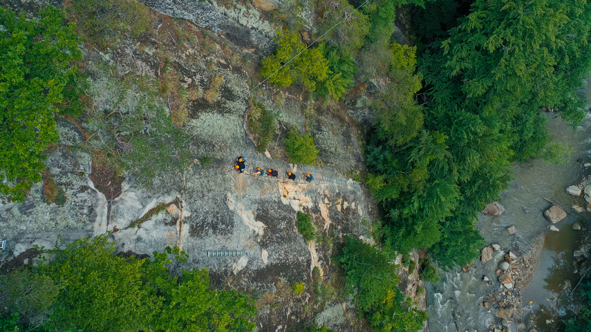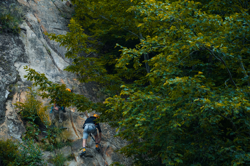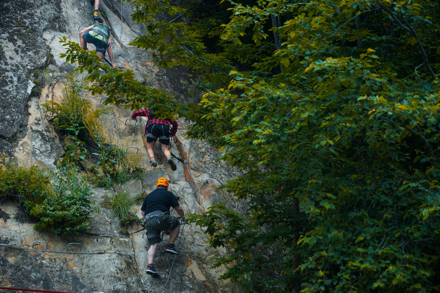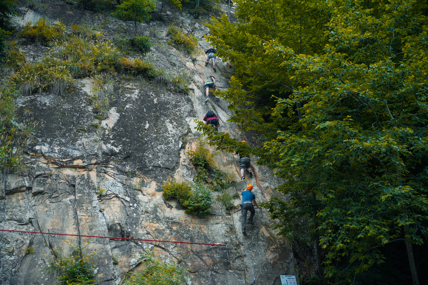 Nu mă dădeam în vânt după ascensiunea aia, nu sunt genul montagnard, în schimb, îmi doream tare de tot să mă dau cu tiroliana care are aproape 300 de metri lungime. Practic, 300 de metri de adrenalină pură. Dacă aș fi putut, aș fi ales cu ambele mâini să fac doar tiroliană, doar că, să vezi ce, nu se putea ajunge la ea decât făcând și ascensiunea.