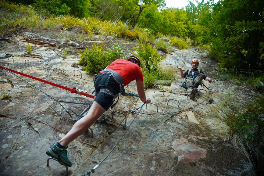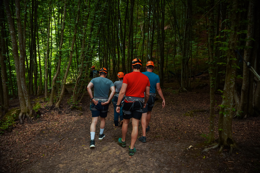 Aia e, mi-am zis, mergem să ne cățărăm, că dacă nu mă dau în tiroliană o să mor de ciudă. Ne-au echipat corespunzător băieții ăia de acolo, ne-au făcut instructajul, și-am pornit cu instructorul ghid în fața. Cât am mers prin pădure a fost relativ ok, după care am ajuns la un perete vertical de stâncă, perete care trebuia urcat pe genul alpinist. Asigurat cu carabinierele de cabluri, și tot tacâmul. Ne-a arătat omul ăla, ghidul cum trebuie să procedăm, și-am început cățărarea.