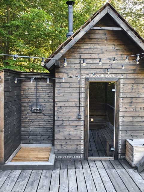 Și dacă toate astea n-au fost de ajuns să vă convingă că așa arată raiul văzut de aproape, vă dau acum lovitura de grație. Tot afară, pe cerdac, există saună și duș exterior. Evident, ai duș și în casă, dar, prieteni, nu vreți să știți cum e să faci un duș fierbinte afară, în aerul ăla demențial din creierii dimineții. Pur și simplu simți cum îți injectează cineva viață.