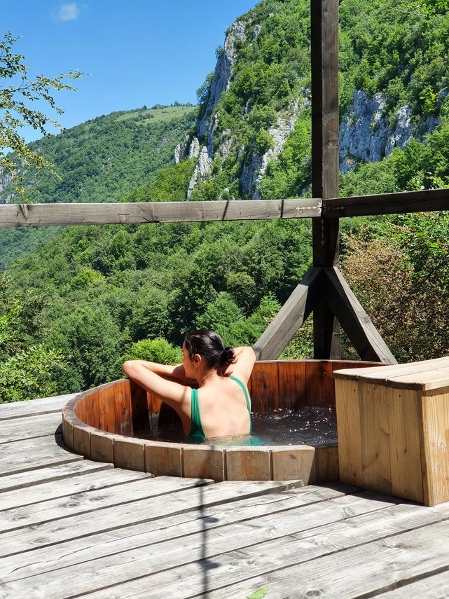 În plus, căsuța noastră are un cerdac (adică o mică terasă) doar al ei, cu un view demențial. Acolo, pe terasă, se află un ciubăr cu apă caldă și bule (un fel de jacuzzi avant la lettre). Da, mai există la Raven’s Nets un ciubăr mare pe care-l poate utiliza oricine dintre oaspeți, dar la Casa Zmeilor ai ciubărul tău personal.